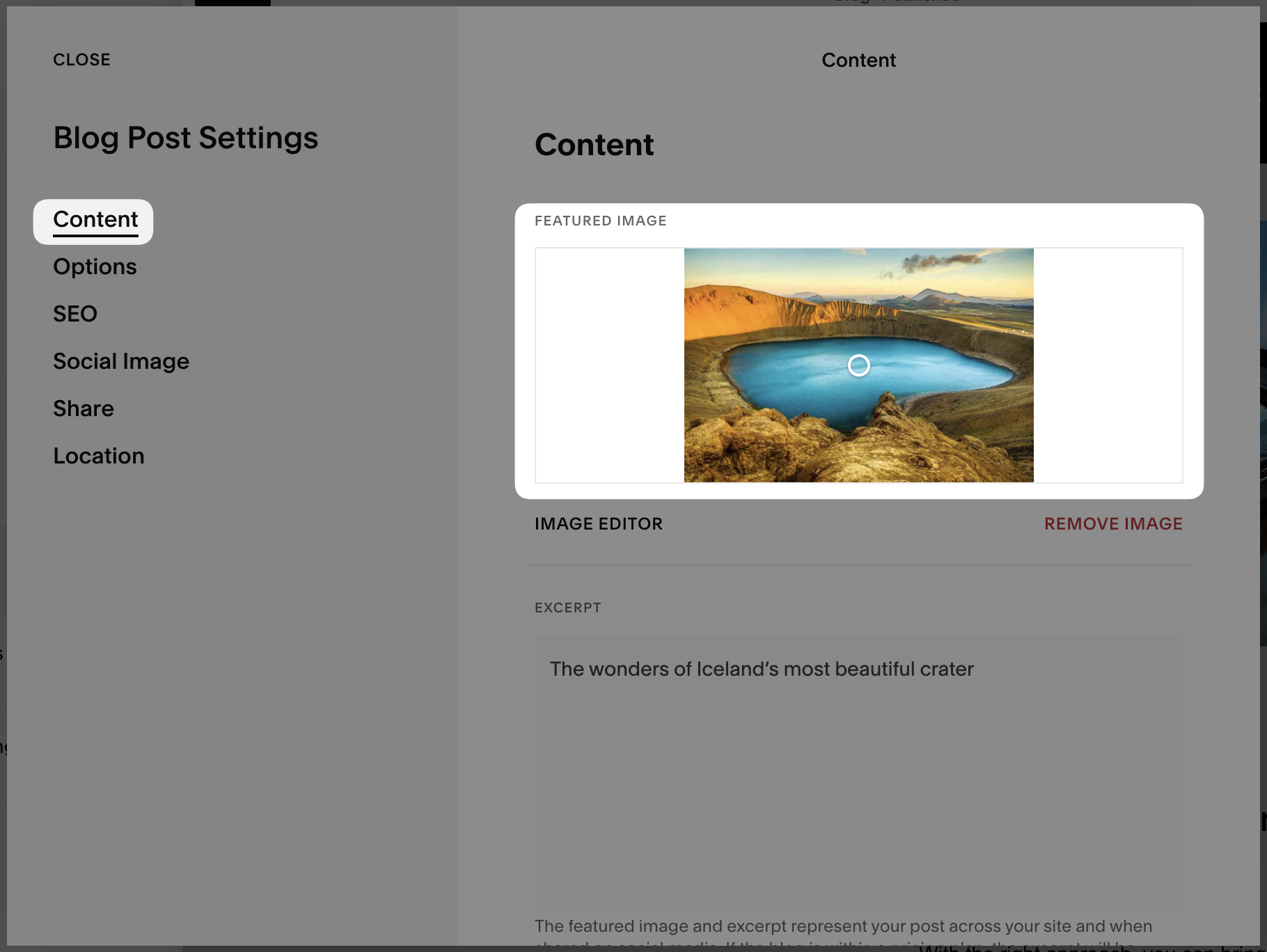 • For a blog page: we show the "Featured Image", which you can find in your Squarespace interface under Blog Post Settings. If no Feature Image is set, we'll show the "Social Image" (see below), and if that is also not set, we'll show the first valid image we can find on the page.